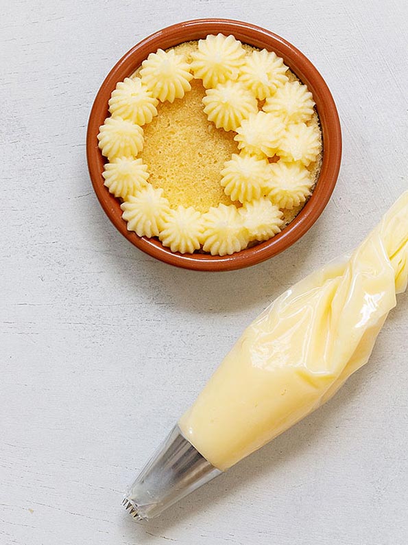 - Ponemos la crema pastelera en una manga y rellenamos por encima, del bizcocho, haciendo copetes.