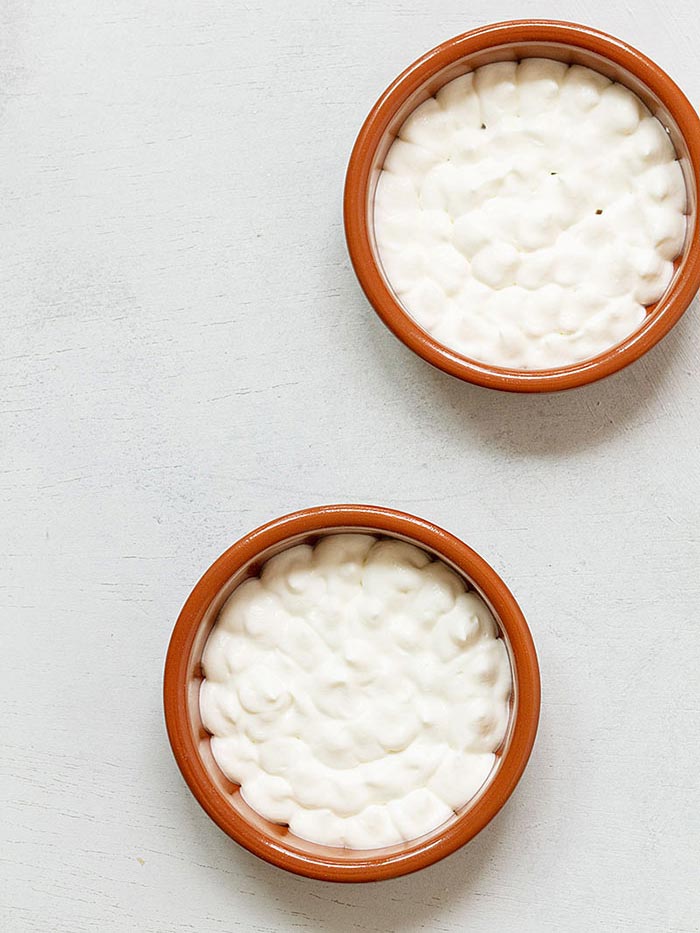 - Ponemos una base de nata en el fondo de la cazuelita de barro u otro recipiente individual