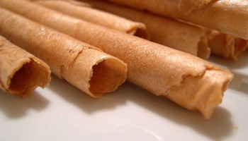 Vertemos el granizado de fresas en los vasos de chocolate y decoramos con unos barquillos.