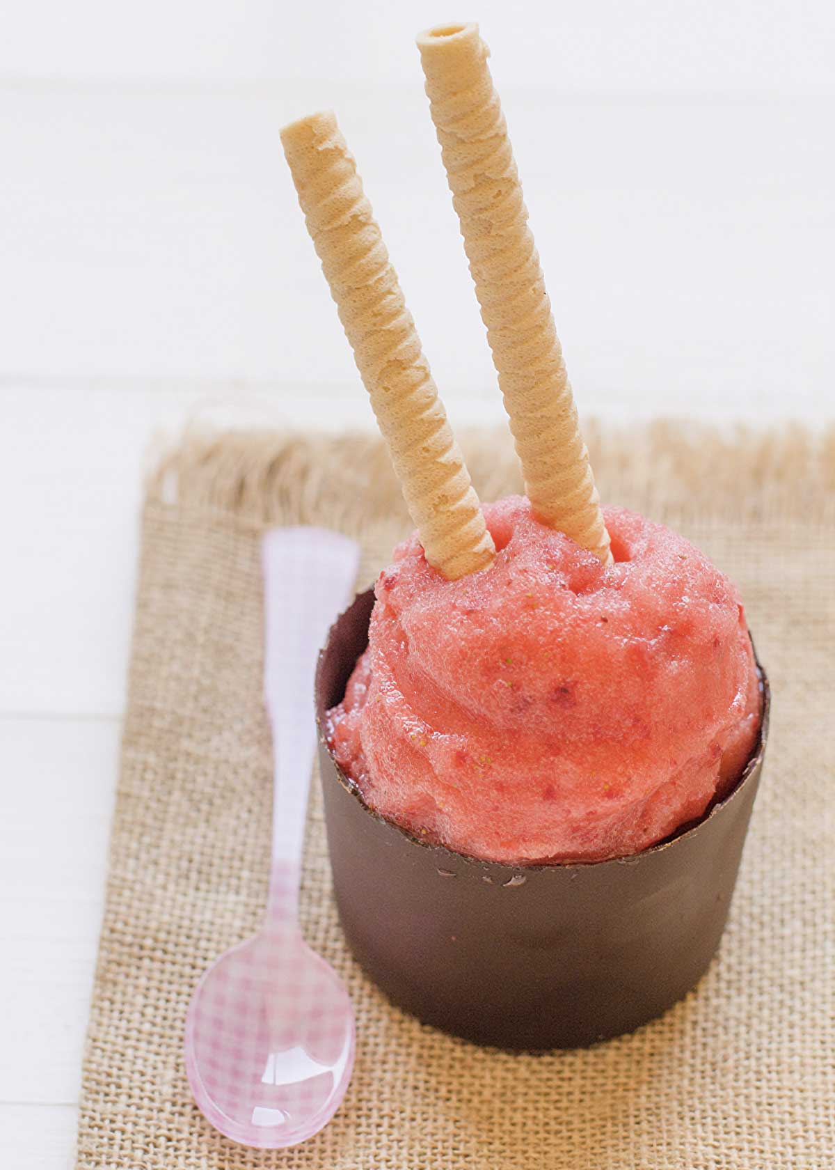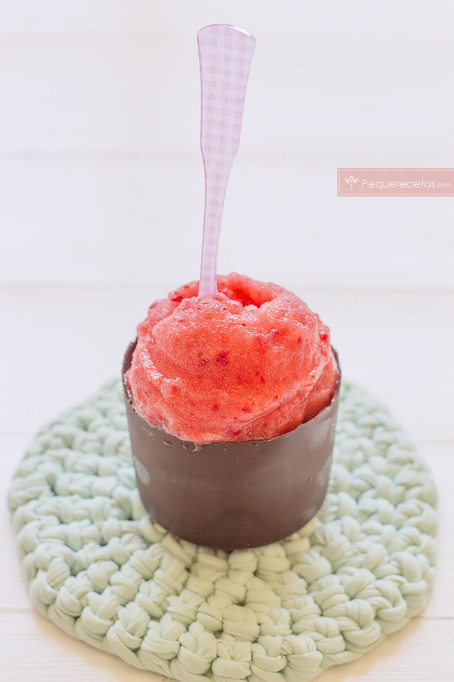 Los granizados de frutas, además de refrescarnos, nos aportan muchas vitaminas, y esta receta de granizado de fresa está especialmente buena, porque además lo vamos a preparar en unos vasos de chocolate muy originales y fáciles de hacer.