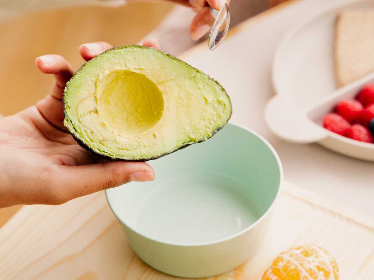 - Corta el aguacate por la mitad, retira el hueso y saca la pulpa con una cuchara.