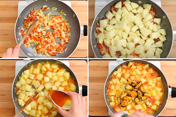 - Cubrimos con agua ya caliente hasta cubrir las patatas, agregamos el escabeche de los mejillones y dejamos cocer hasta que las patatas estén cocidas pero firmes.