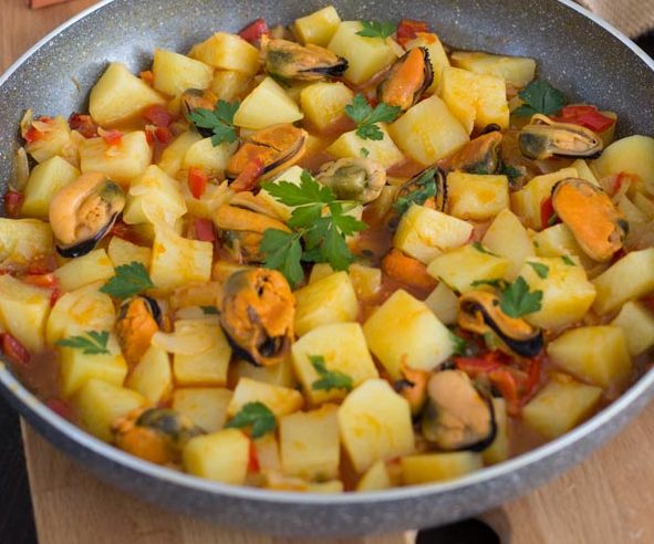 Cómo hacer guiso de patatas con mejillones en escabeche