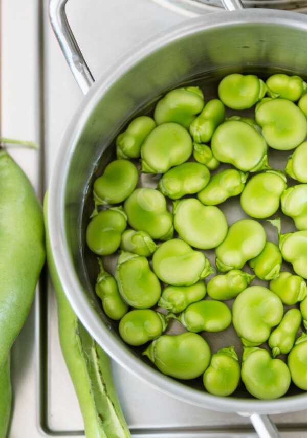 - Incorporamos las habas, la menta, el vino, el agua y una pizca de sal. Programamos 15 minutos, Varoma, giro inverso, velocidad cuchara.
