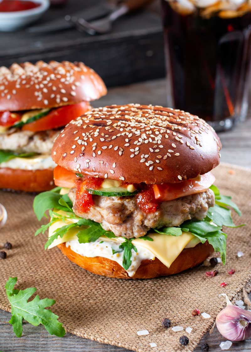 Acompañamos en un pan de hamburguesa casero con nuestro acompañamiento preferido, queso en lonchas, lechuga, tomate, pepinillos, etc… La aliñamos también con salsa de kétchup casero y mayonesa.