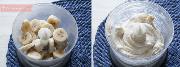 - Quitamos el plátano del congelador y lo dejamos a temperatura ambiente por 5 minutos, luego lo ponemos en el robot de cocina, la picadora o la licuadora (en este caso deberá ser potente) y licuamos por 2 o 3 minutos, raspando los bordes con una espátula cada tanto para que se mezcle bien, hasta que se forme una crema homogénea. Servimos inmediatamente.