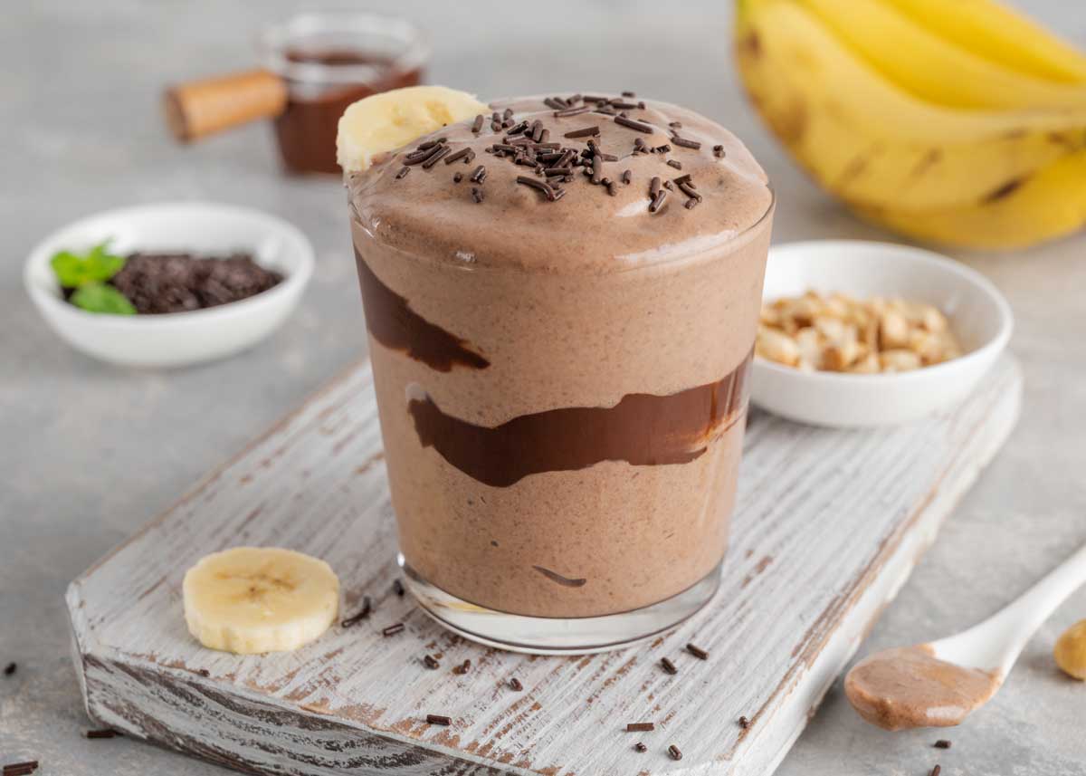 - Decoramos con los fideos de chocolate, algunas rodajas de plátano y cacahuetes salados picados. Los toppings son opcionales, nosotros os damos algunas ideas que combinan bien, pero puedes poner otro tipo de frutos secos picados, como almendras, o pistachos.