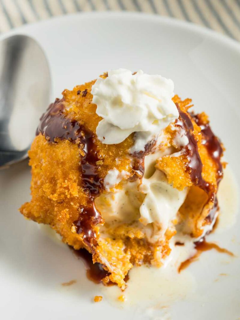 - Sirve el helado frito de inmediato. Añade sirope de chocolate y nata montada si quieres llevarlo al siguiente nivel.