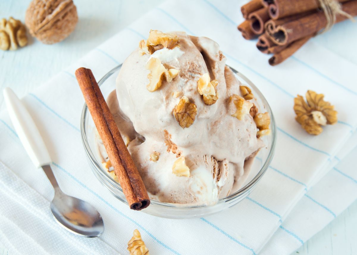 - Transfiere el helado de canela y nueces sin almendras a un recipiente apto para congelador y cúbrelo con papel film o una tapa hermética. Déjalo en el congelador durante al menos 4 horas o hasta que esté completamente congelado.