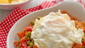 Otra receta típica española son estos huevos a la flamenca, un plato completísimo que no necesita nada más porque lleva patatas, verduras, legumbres y el huevo.