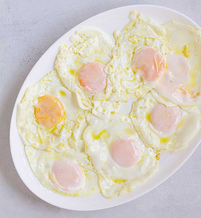 - El huevo estará listo cuando la clara haya cuajado y se haya formado una película blanca sobre la yema. El punto depende de los gustos, si te gusta la yema bien jugosa apenas la clara haya cuajado y se haya formado la película blanca sobre la yema, puedes retirarlos, serán al máximo 2 minutos, menos incluso. Si quieres que cuaje un poco más pues lo dejas más tiempo, en este caso baja el fuego para que no se queme por debajo.
