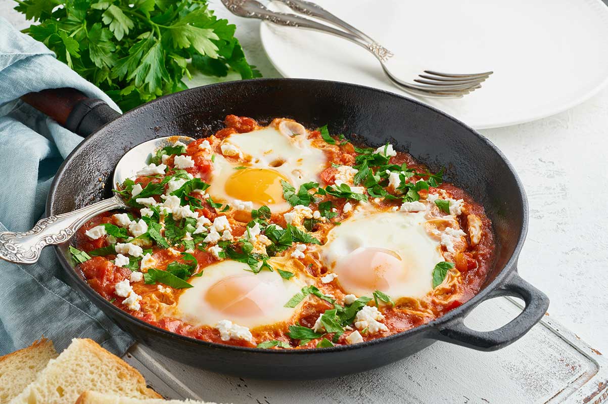 El shakshuka es un plato de la comida de Oriente Medio realizado a base de huevos escalfados en salsa de tomates, chiles y cebolla. Vale, la receta es más similar a unos huevos al plato, pero con los huevos fritos en lugar de escalfados en el tomate se convierte en algo casi pecaminoso.