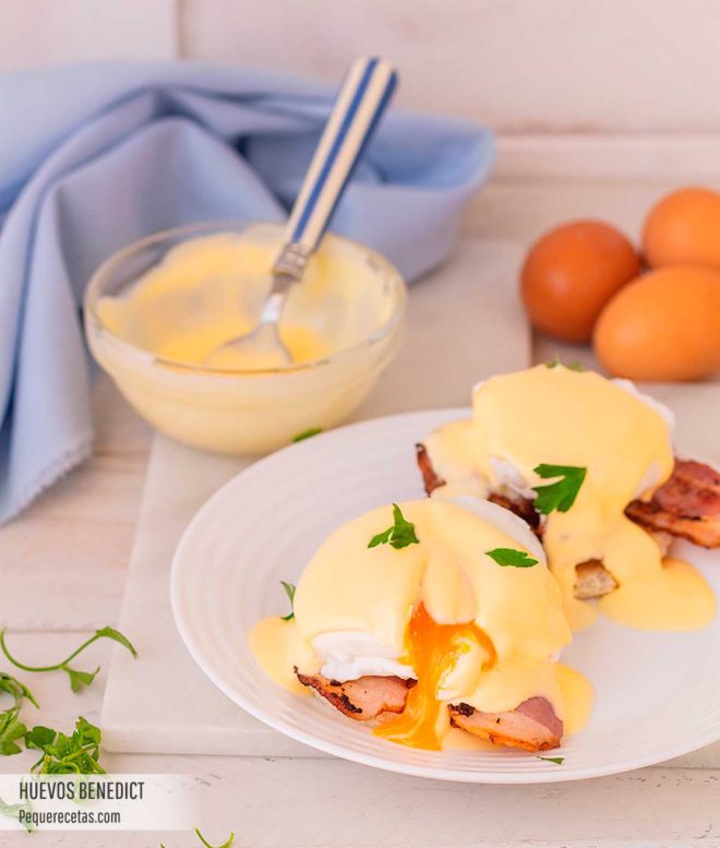 Pero, ¿qué son los huevos Benedict y cuál es su origen…? Los huevos Benedictinos consisten en unos huevos escalfados sobre una loncha de bacon o jamón York, que se colocan sobre dos mitades de muffins ingleses u otro tipo de panecillo tostado, y que se cubren con abundante salsa holandesa.