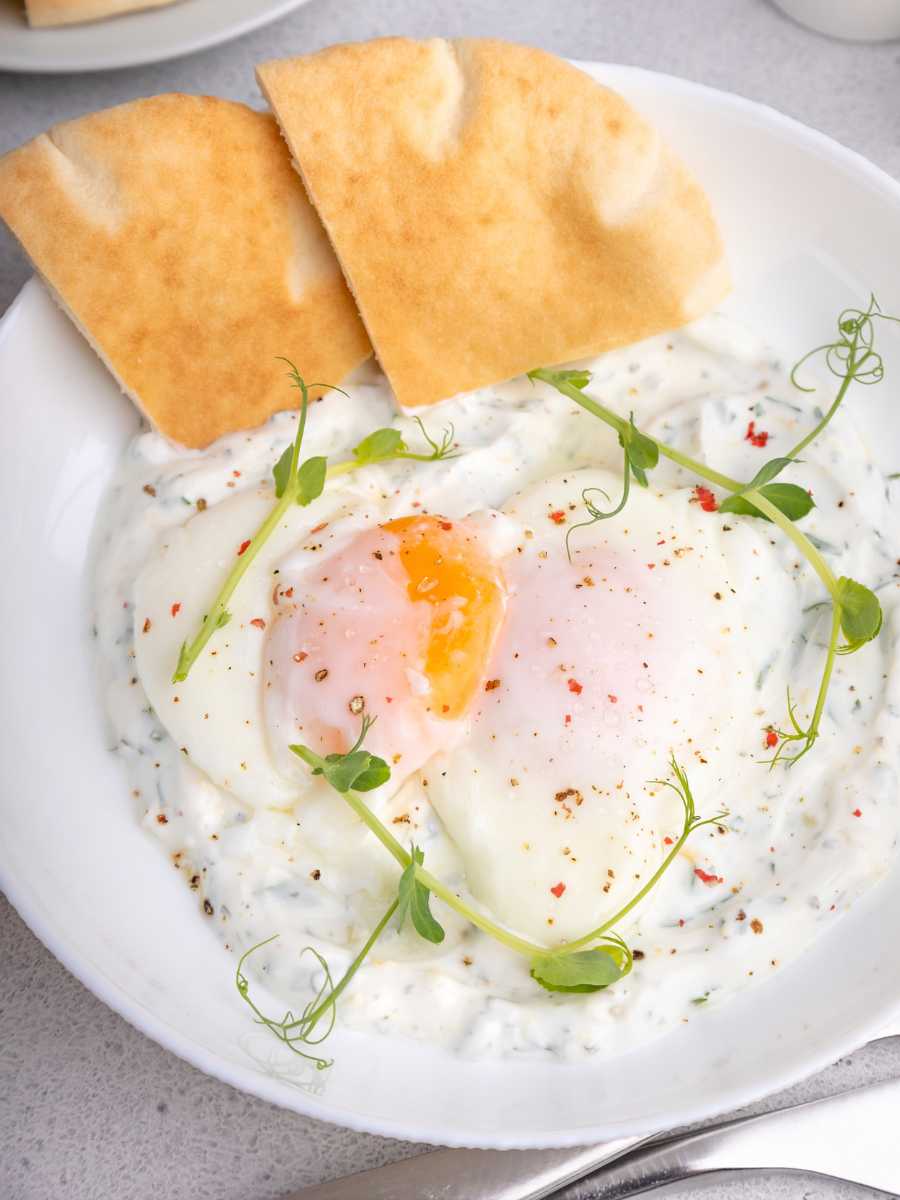 Sirve los huevos turcos en platos blancos para resaltar los colores del plato. Puedes decorar con brotes frescos, un chorrito adicional de mantequilla con pimentón para un acabado visual atractivo. Un pan pita caliente es ideal para mojar en el yogur y la mantequilla con pimentón.