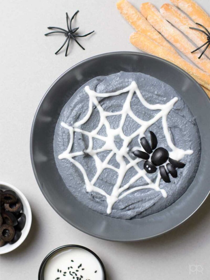 Si creías que el hummus no podía ser un plato de Halloween, aquí va una idea para darle un giro escalofriante a este clásico. Con un par de aceitunas negras y un poco de mayonesa, puedes transformar el hummus en el centro de mesa perfecto para tus aperitivos de Halloween.
