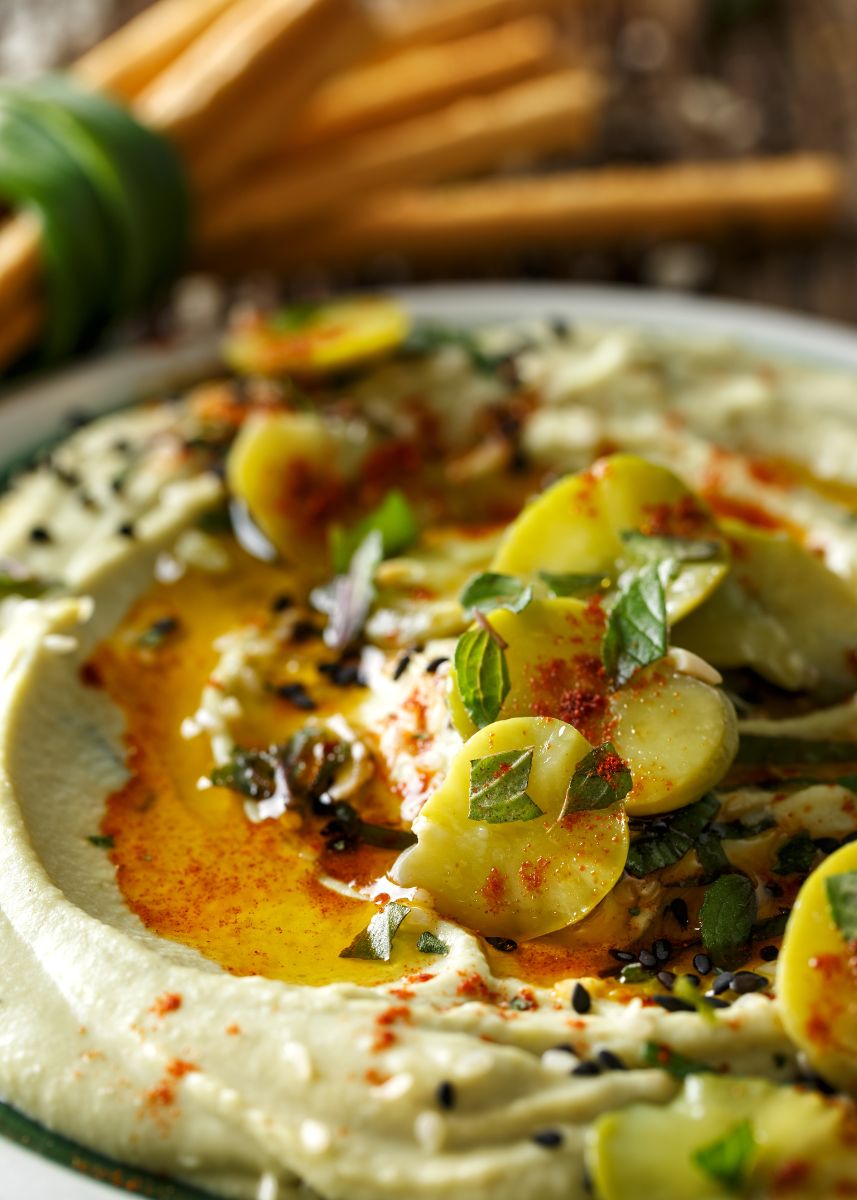 Sirve el hummus de habas frescas con trozos de pan pita, crudités de verduras frescas o grissini. La combinación de pimentón dulce, hierbas aromáticas y sésamo añade capas de sabor y textura, haciendo que este hummus sea verdaderamente excepcional.