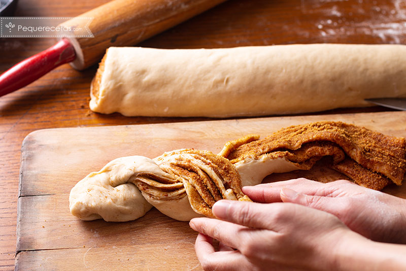 • Nosotros preferimos integrar los frutos secos bien molidos al relleno, pero también si os gusta encontrar los trocitos se pueden esparcir troceados por encima del relleno antes de enrollar. También podemos añadir uvas pasas hidratadas en algún vino dulce, o trocitos de manzana. También se puede hacer una trenza de chocolate usando en el relleno una crema de chocolate para untar.