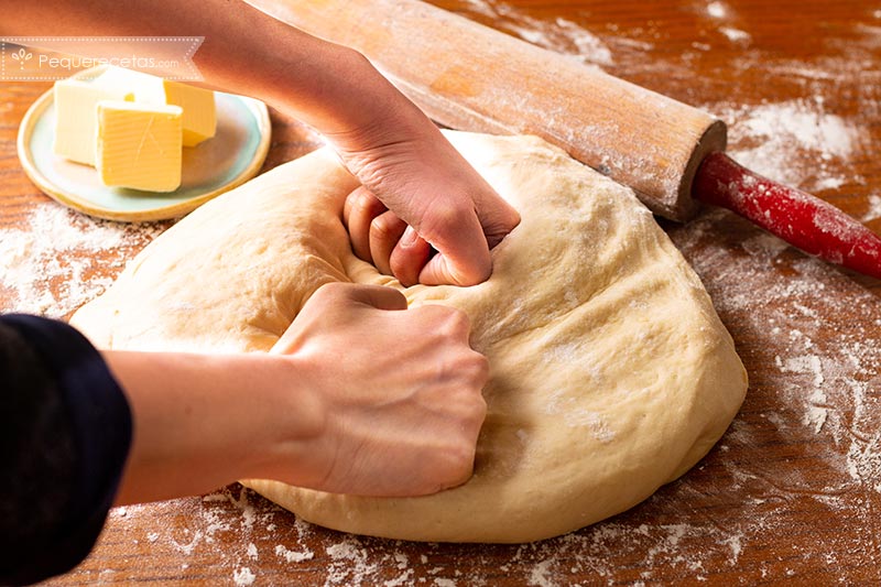 - Una vez que la masa ha duplicado su volumen, la pasamos a la mesa de trabajo ligeramente enharinada y la desgasificamos, es decir la amasamos un poco para desinflarla.