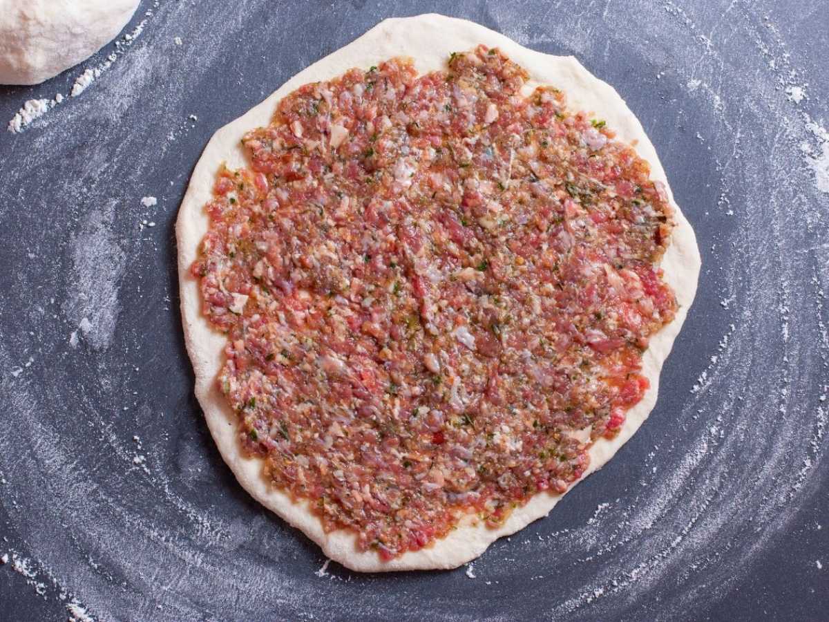 Tradicionalmente, el lahmacun se prepara con una base de masa muy fina que se cubre con una mezcla de carne picada, principalmente de cordero, aunque también se usa ternera, y una combinación de tomates, pimientos, cebolla, ajo y una variedad de especias como comino y pimentón. Esta mezcla se extiende sobre la masa y se hornea en un horno de leña, lo que le da un sabor ahumado y una textura crujiente.