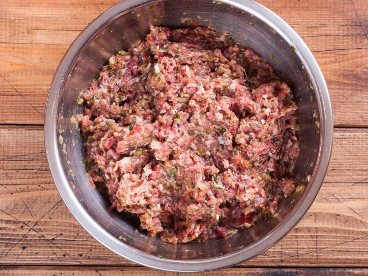 - En un bol grande, mezcla la carne picada, los tomates, el pimiento, la cebolla, el ajo, la pasta de tomate y las especias.
