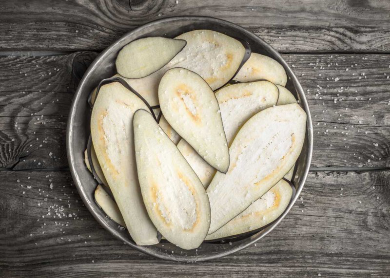 - Lavamos la berenjena y la cortamos a lo largo en láminas finas (puedes usar una mandolina). Las salamos y dejamos reposar unos 10-15 minutos para que suelten el amargor. Después, las secamos con papel de cocina.