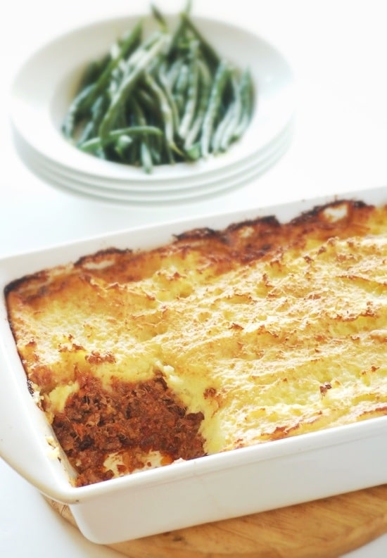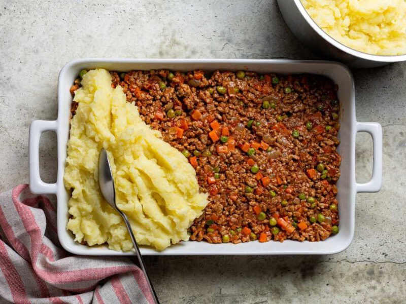 - Extiende el puré de patatas uniformemente sobre la capa de carne.