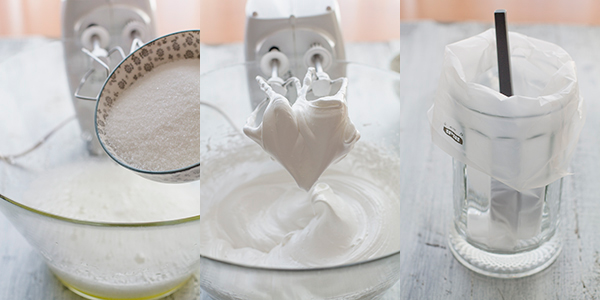 - Batimos las claras con el azúcar glass hasta obtener un merengue.
