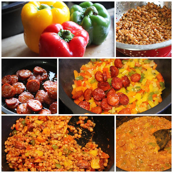 A estas lentejas con chorizo les pongo también mucha verdura, porque también añaden mucho sabor al sofrito previo. Las de hoy llevan pimientos de tres colores, cebolla y zanahorias, pero otras veces les pongo calabaza, calabacín o berenjena, según tenga por casa.