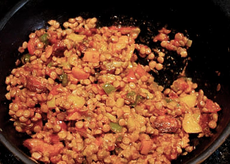 - Removemos bien mientras la harina se cocina, incorporamos todas las especias, las lentejas y el tomate frito.