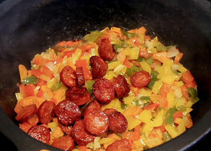 - Le quitamos la piel al chorizo y lo cortamos en rodajas