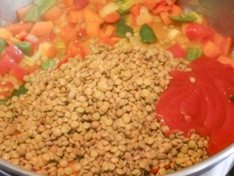 - Incorporamos las lentejas que hemos lavado y salteamos un par de minutos