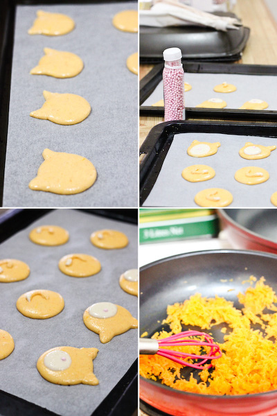 Agregar colorante naranja para alimentos al resto de la preparación y mezclar bien hasta obtener la consistencia correcta. Para ello, corroborar que la mezcla fluya como lava y que al tirar un poco de la mezcla sobre la superficie total se unifique tras aproximadamente 30 segundos. Colocar la mezcla naranja en una manga pastelera y hacer círculos de alrededor de 3-4cm sobre la bandeja del horno, previamente preparada con papel para hornear (alrededor de 10 círculos por placa de horno). Dejar suficiente espacio entre un círculo y otro para luego hacer las orejas de los gatitos.