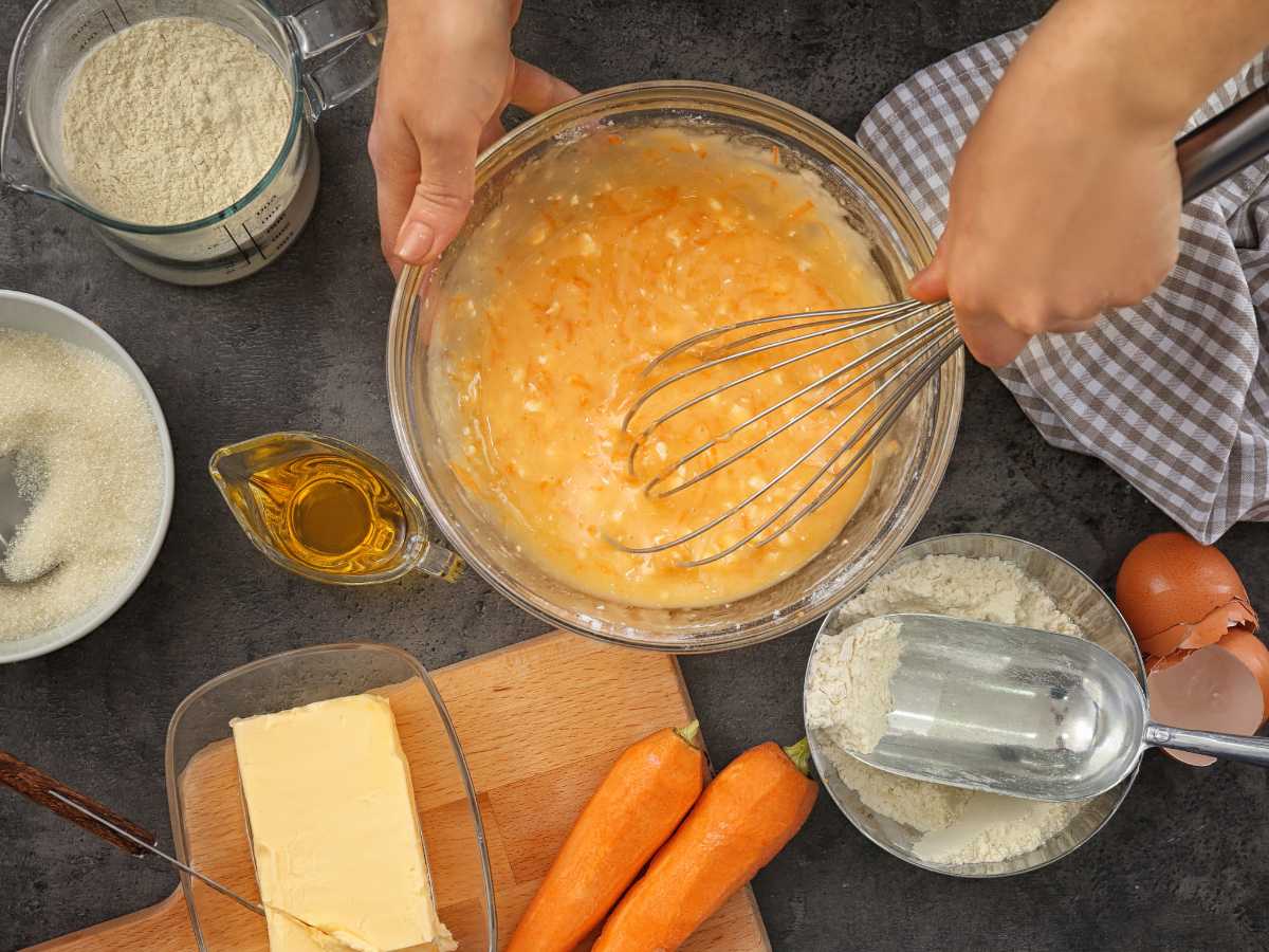 - Tamizamos las harinas, la levadura y una pizca de sal sobre la zanahoria.