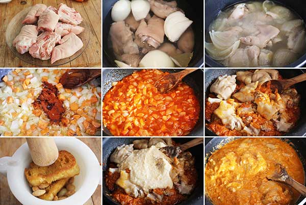 Se trata de una receta de manitas de cerdo con salsa de almendras, que hoy compartimos con todos vosotros, así es como se han cocinado siempre en casa: primero se cuecen y luego se añaden a un sofrito de verduras junto con un majado de almendras, ajos y pan, y se cocina todo junto a fuego lento hasta que las manitas quedan muy tiernas, se deshacen en la boca y la salsa… ¡ay! la salsa, solo os decimos que no os puede faltar el pan.