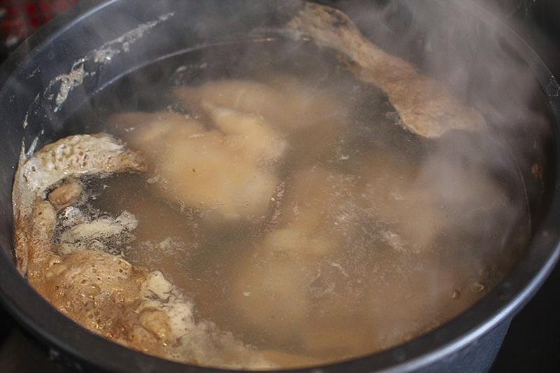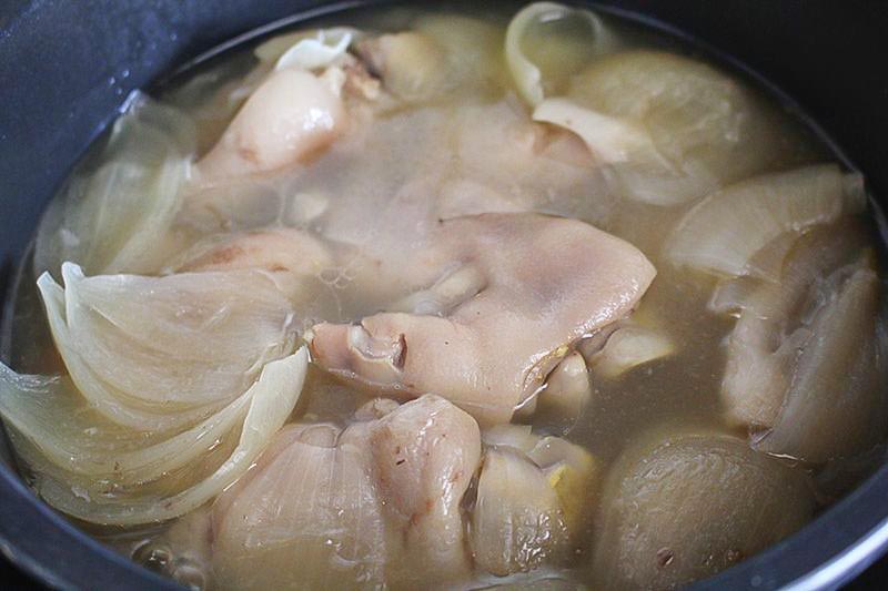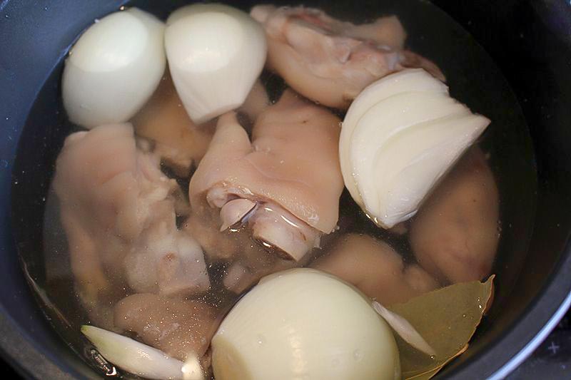 - Volvemos a poner las manitas en una olla con agua, dos hojas de laurel, sal y una cebolla cortada en trozos.