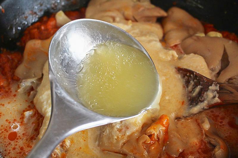 - Añadimos también un poco de caldo de la cocción de las manitas, uno o dos cucharones.