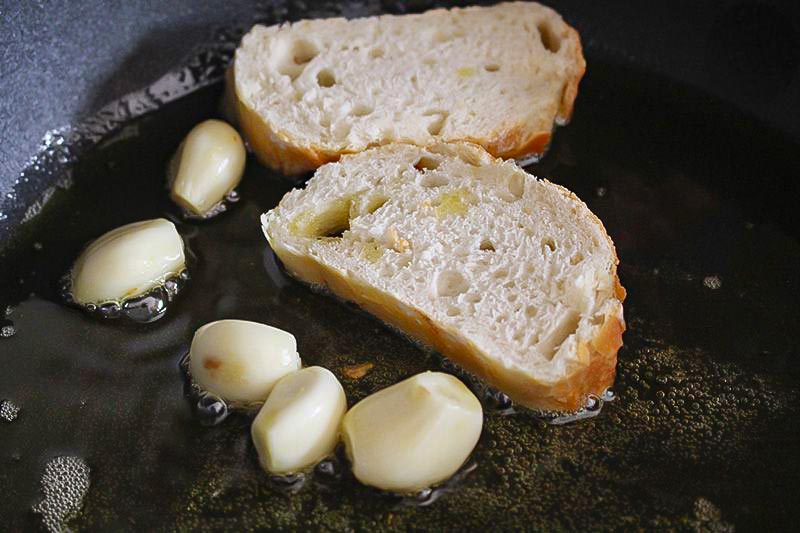- En una cazuela ponemos aceite de oliva virgen extra, freímos el pan y los ajos.