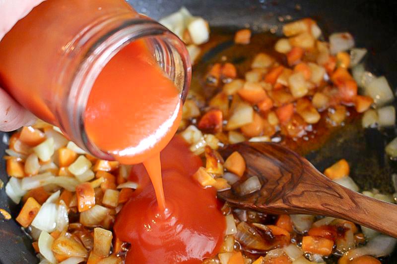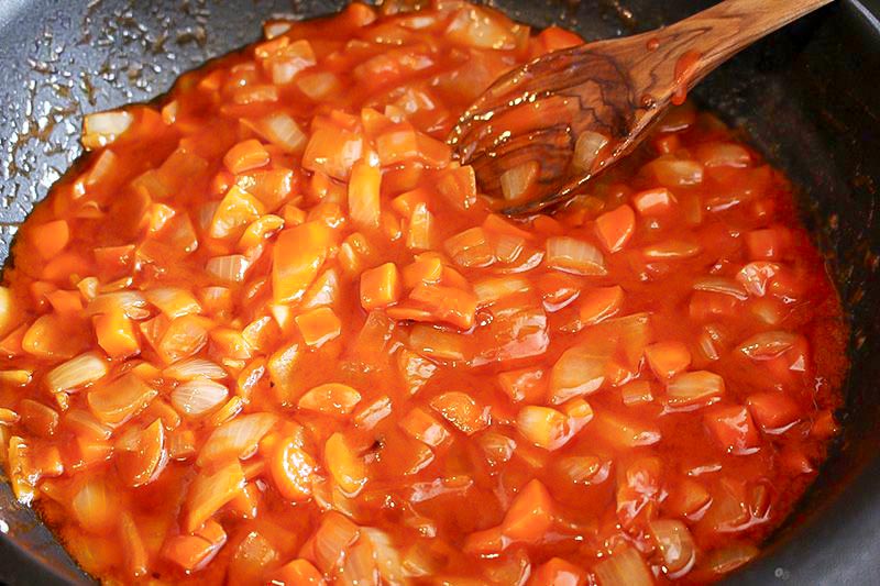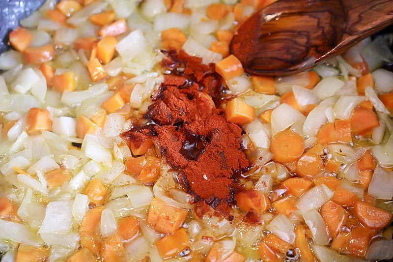 - Cuando comience a dorarse la cebolla, añadimos 1 cucharada de pimentón dulce o picante, al gusto.