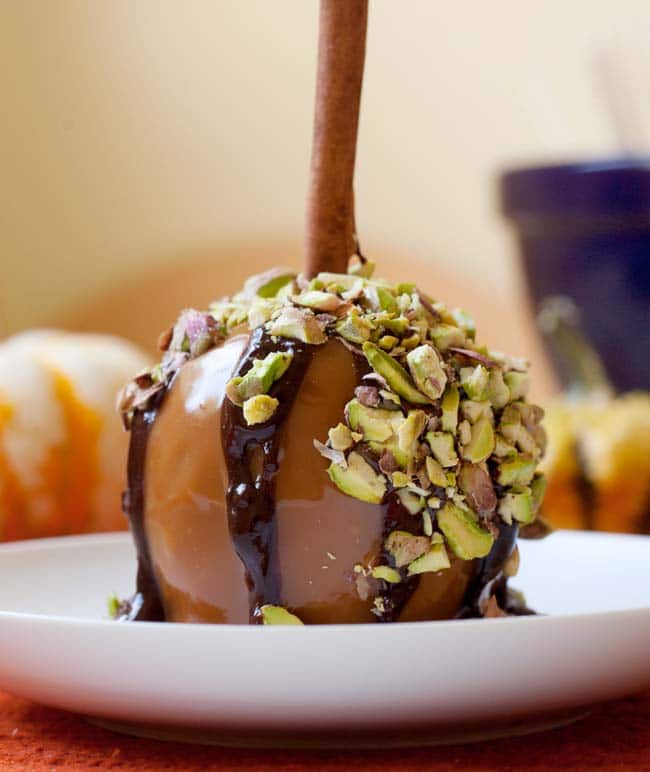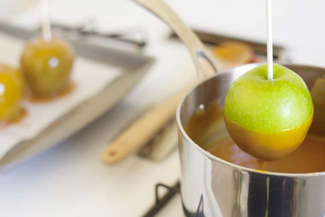 - Ponemos el palito a las manzanas y sumergimos en el cazo con el caramelo hasta cubrirlas por completo.