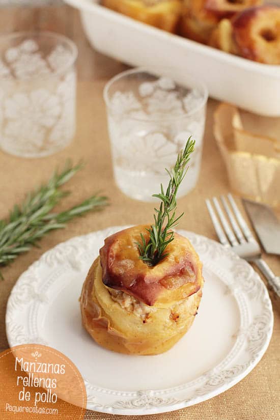 A la hora de servir nuestras Manzanas rellenas de pollo, ponemos en el centro una ramita de romero y regamos con el jugo que han soltado.