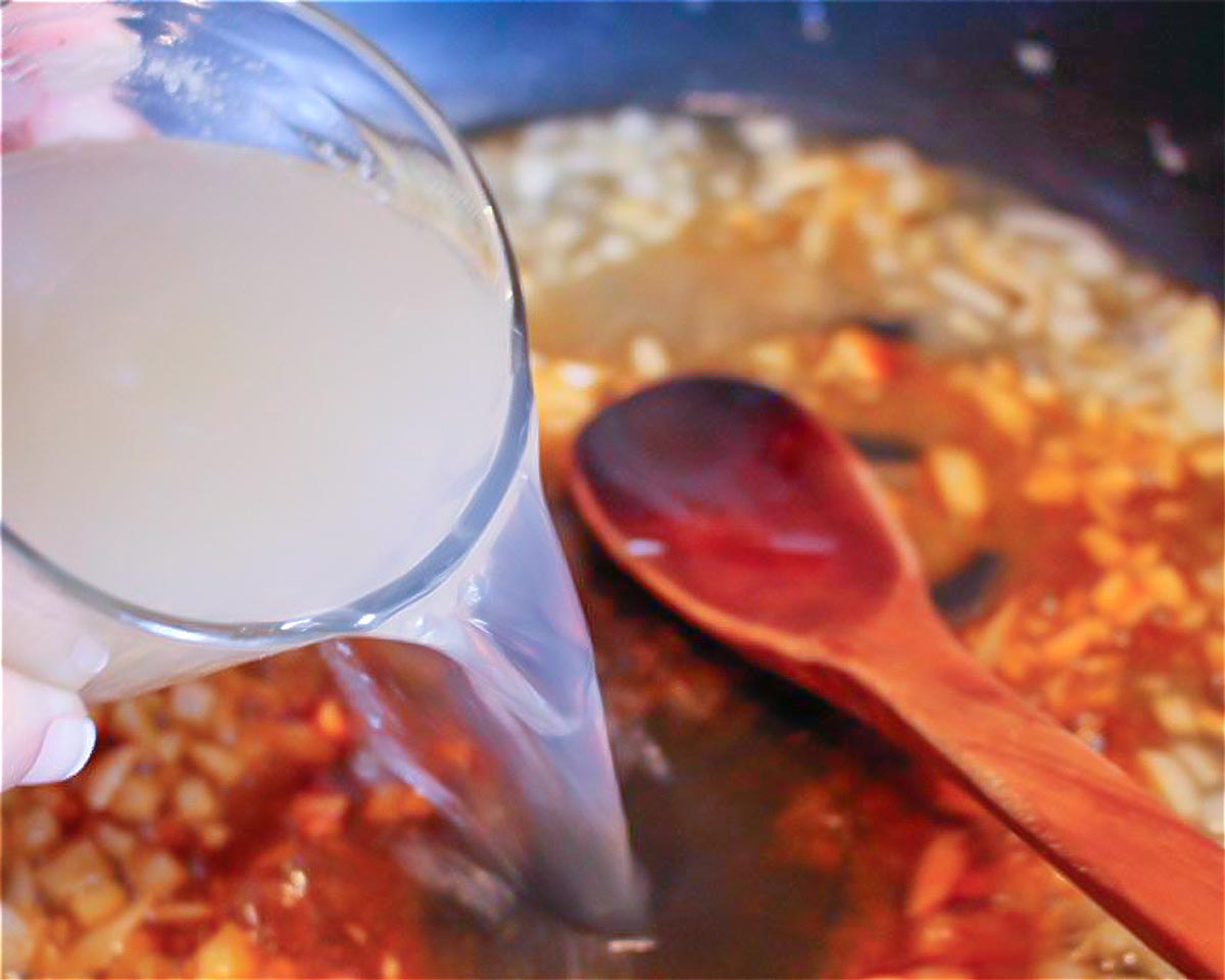- Luego, añadimos un vaso del caldo de los mejillones que habíamos reservado y medio vaso de vino blanco