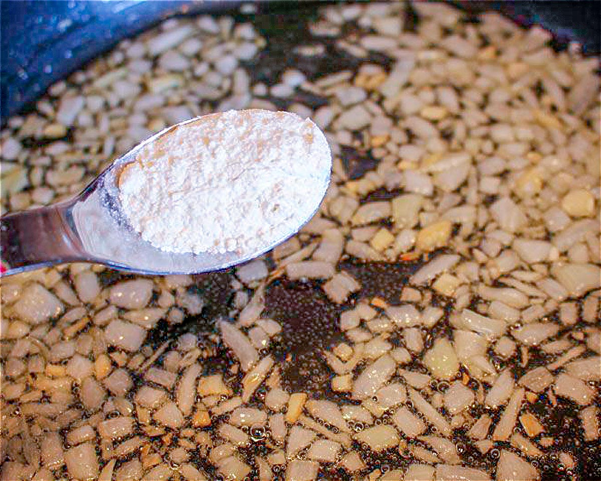 - Cuando comiencen a dorarse, añadimos la harina y rehogamos durante un par de minutos para que no nos sepa a crudo.