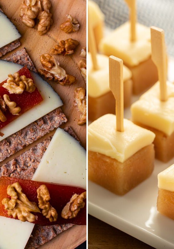 250 g de queso de oveja curado rallado; 250 g de queso crema; 200 ml de nata para montar; 3 huevos; 150 g de azúcar; 1 cucharada de harina de maíz (maicena); 1 cucharadita de extracto de vainilla; 150 g de membrillo en cubos pequeños; azúcar glas para decorar.