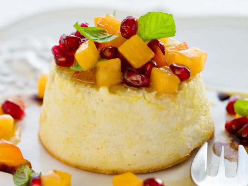 - Antes de servir, desmoldamos y decoramos con mango, granada y hojas de menta. Podemos añadir un toque de reducción de balsámico para potenciar los sabores.