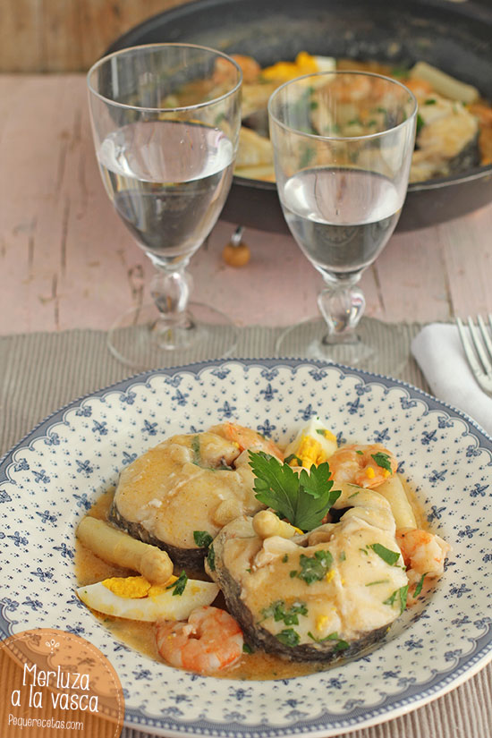 La merluza a la vasca es una opción estupenda para servir pescado , además es un plato principal muy completo ya que va acompañada de espárragos blancos, huevo y gambas o langostinos, por lo que no hace falta hacer algo más para acompañar.