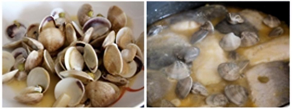 - Añadimos las almejas, tapamos la cazuela y conforme se vayan abriendo las vamos retirando a un plato (así conseguiremos que no se nos resequen).