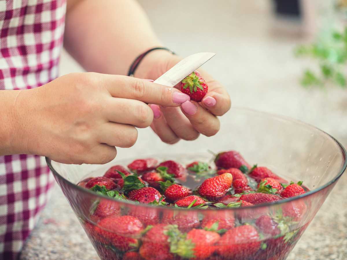• Lavamos las fresas bien bajo el agua fría. Les cortamos el rabito y troceamos.