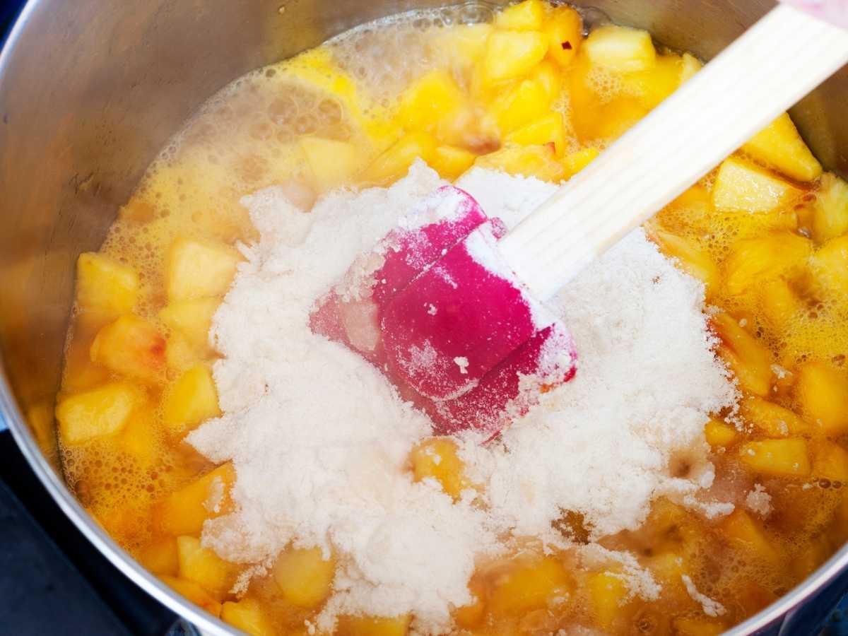 - Incorporamos la pectina a la olla con los melocotones y mezclamos bien. Nos aseguramos de que la pectina se disuelva completamente en la mezcla.