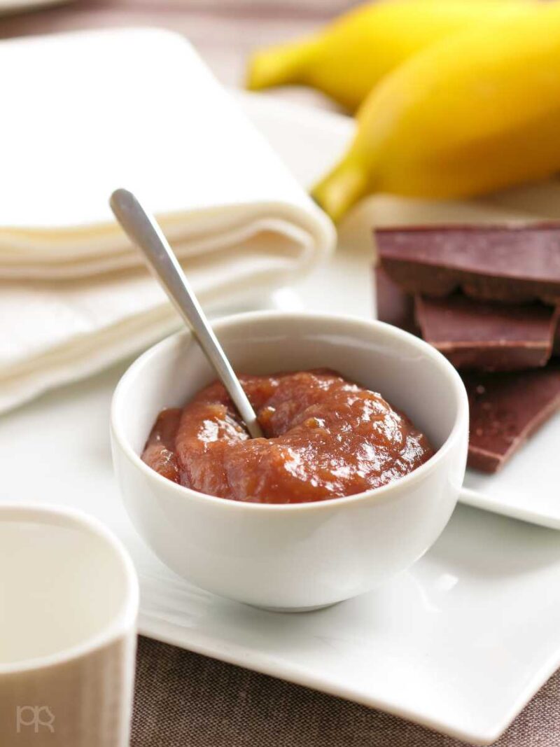 - Cuando los plátanos estén blandos, trituramos la mezcla hasta obtener una textura suave. Agregamos el chocolate y cocinamos durante los últimos 5 minutos hasta que se derrita e integre bien.