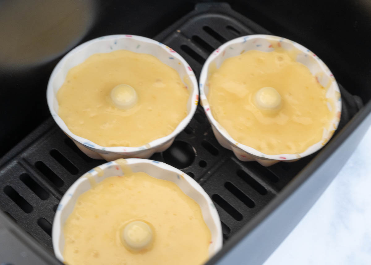 - Dependiendo del tamaño de vuestra freidora de aire os entrarán más o menos, lo normal es que os entren aproximadamente 6 moldes por lo que tendréis que repetir el proceso 2 veces si queréis hacer los 12 bizcochos que salen de la receta.